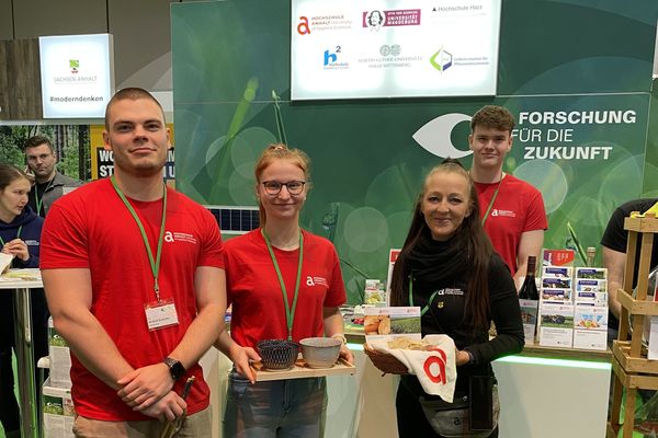 Zu den 25 vorgestellten Projekten gehörte unter anderem die vom Bundesministerium für Wirtschaft und Klimaschutz der Bundesrepublik Deutschland (BMWK) geförderte „Myzel Bike-Box“. Prof. Dr. Manuel Kretzer und Anna Gronemeyer arbeiten am Fachbereich Design der Hochschule Anhalt (HSA) an der Entwicklung von Lieferboxen aus Myzel - einem stabilen und witterungsbeständigen Pilzgeflecht. Diese eignen sich beispielsweise für den Transport von Gegenständen mittels Lastenfahrrad. Leguminosenbrötchen konnten die Besucher der Messe am Gemeinschaftsstand bei Vertretern des Studiengangs Ökotrophologie der HSA probieren. Das Backwerk enthält neben klassischem Weizenmehl auch Anteile von Leguminosenmehlen, die etwa aus Erbsen und Ackerbohnen gewonnen werden und ihm eine hochwertige Proteinzusammensetzung verleihen.